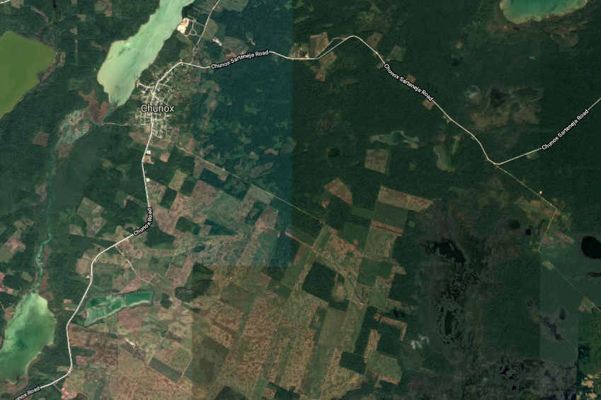 An aerial view of Chunox and the surrounding area show massive deforestation encroaching. Deforestation is one of the leading causes of climate change. Image courtesy of Google Earth.